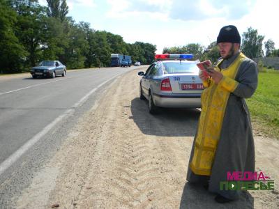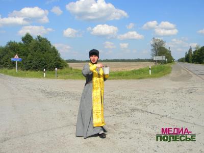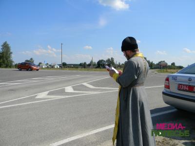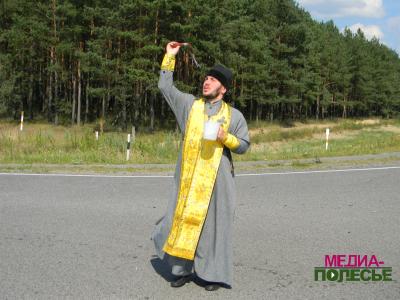 Первым остановочным пунктом на пути священнослужителя и сотрудника ГАИ стал перекрёсток на трассе М-10 «Граница РФ-Гомель-Кобрин» при повороте на деревню Синкевичи, унёсший недавно жизни четверых человек. Отец Сергий прочёл молитву и окропил перекрёсток святой водой.
