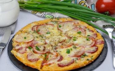 Домашняя пицца с сервелатом и томатами с сыром на сковороде