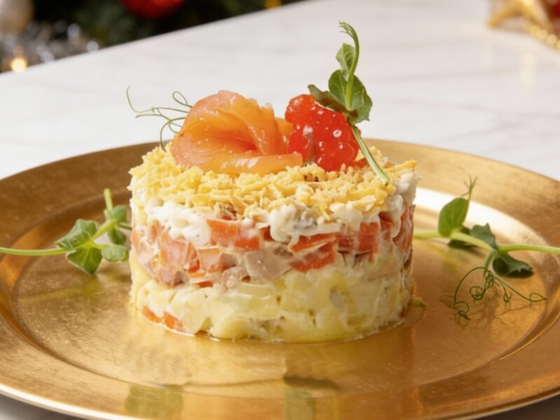 Слоёный салат «Северное сияние» с красной рыбой