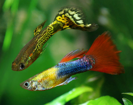 Гуппи — самые нетребовательные рыбки. Самки гуппи крупнее своих «супругов», невзрачные, серого «рыбьего» цвета. Самцы отличаются разнообразием окраски, яркими хвостовыми вуалеобразными плавниками. Будучи живородящими, гуппи легко размножаются: самки мечут вполне сформировавшихся мальков, способных сразу же питаться мелким планктоном и измельченным сухим кормом. Но можно обойтись и вовсе без самок, а завести сразу десяток самцов (аквариум минимум на 20 л), которые в исключительно мужской компании будут ярче, крупнее и проживут очень долго.