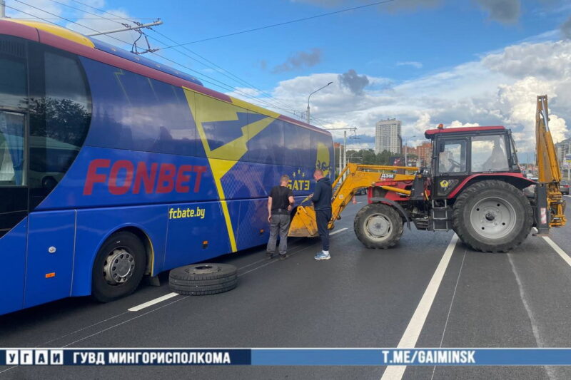6-летний водитель MAN ехал по проспекту Независимости. Во время движения у автобуса сорвались два задних левых колеса, одно из которых выкатилось на встречную полосу, где повредило встречный Buick. В фиксации автобуса помог водитель трактора «Беларус», двигавшийся по проспекту.