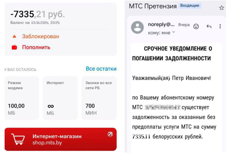 «Был подключен роуминг. Зашел в интернет через минуту — долг в 7335. Стали разбираться. Говорят, что подтянуло вышки Монголии. Стояло две SIM-карты: и российская, и беларусская, но роуминг включен был на второй», — рассказывает Петр.