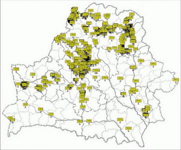 Карта распространение борщевика Сосновского на территории Беларуси по итогам кадастрового обследования 2007–2010 гг.
