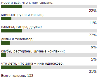 Компьютеру не изменяют 11% респондентов. Диван и телевизор – главные летом для 9%. Чуть меньше – 5% — ни на что не променяют клубы, рестораны, шумные компании.
