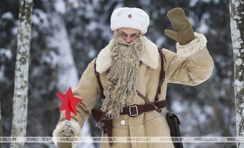 Как информирует райисполком, партизанский Дед Мороз – это собирательный образ. Он носит бороду из пакли, на голове — шапка-ушанка, а на ногах — валенки. Одет в тулуп и подпоясан ремнем с портупеей, в руке держит посох, увенчанный красной звездой.