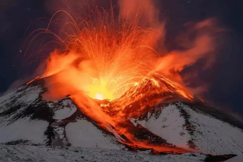 В воскресенье вулкан Этна перешёл в режим «прерывистого» извержения. То есть, извержение начинается, прекращается, а затем вулкан извергается снова. По данным Национального института геофизики и вулканологии (INGV), активность резко усилилась во время этих фаз извержения.