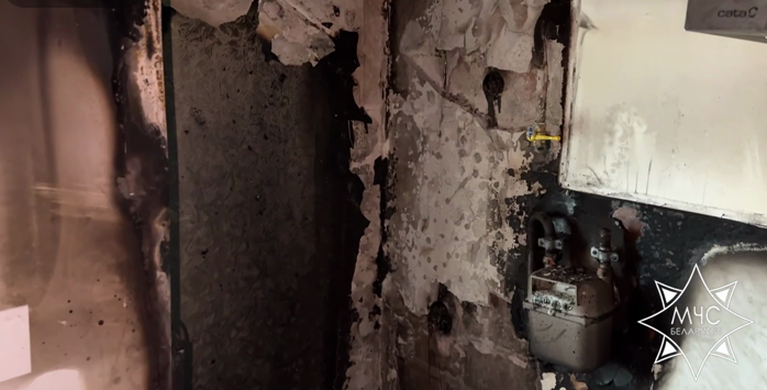 Работники МЧС ликвидировали пожар. Огонь повредил мебель и имущество в кухне, закопчены стены и потолок в квартире.