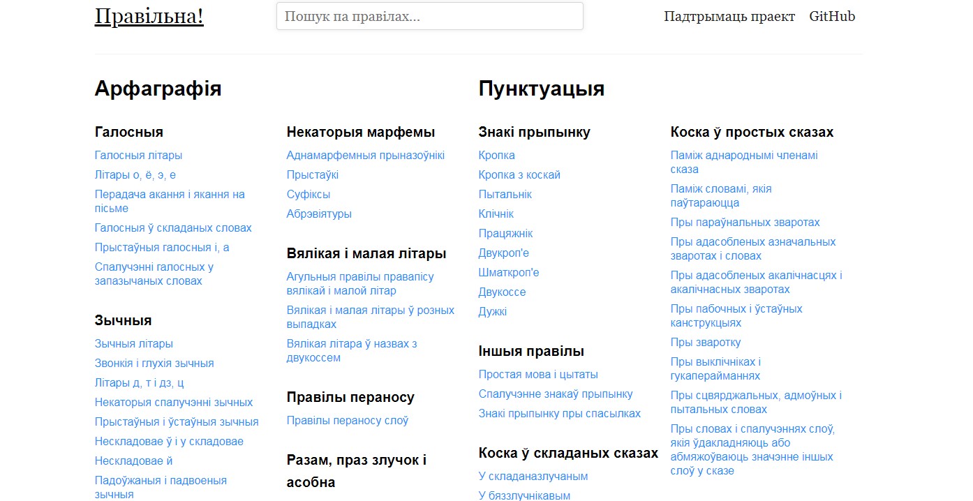 За основу взял закон «Аб Правiлах беларускай арфаграфii i пунктуацыi». Идея была в том, чтобы создать онлайн-сервис, где каждое правило и каждый пункт, на который можно было ссылаться, удобно индексировался. Я продумал, как эти правила технически собрать, обработал и привёл к такому виду, чтобы можно было индексировать в технических системах по отдельным лексемам, примерам. Так и появился сервис «Правільна».