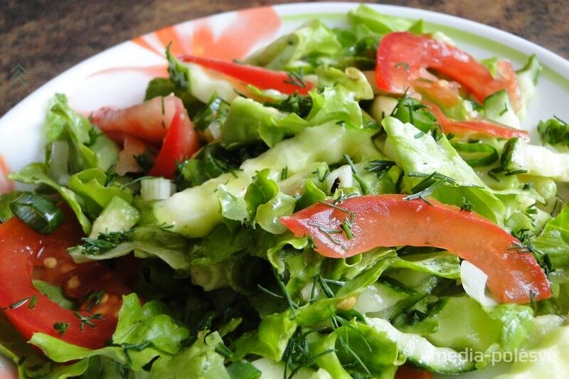 Подготавливаем ингредиенты: огурец нарезаем соломкой, авокадо – кубиками, помидоры – тонкими ломтиками, листья салата рвём на мелкие кусочки, лук и зелень – мелко шинкуем. Всё хорошо перемешиваем. Если любите оливки, можно добавить и их. Солим и перчим.