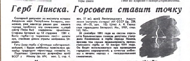 В ответ приведена публикация газеты «Пинская неделя» от 18.10.1991г. со статьёй «Герб Пинска. Горсовет ставит точку».