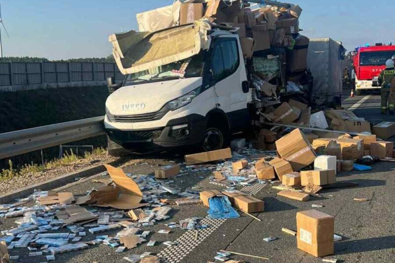 ДТП произошло на трассе S61 возле города Кольно Подлясского воеводства. В Iveco врезался грузовик. Из поврежденного кузова рассыпались тысячи пачек сигарет, сообщает полиция Кольно.