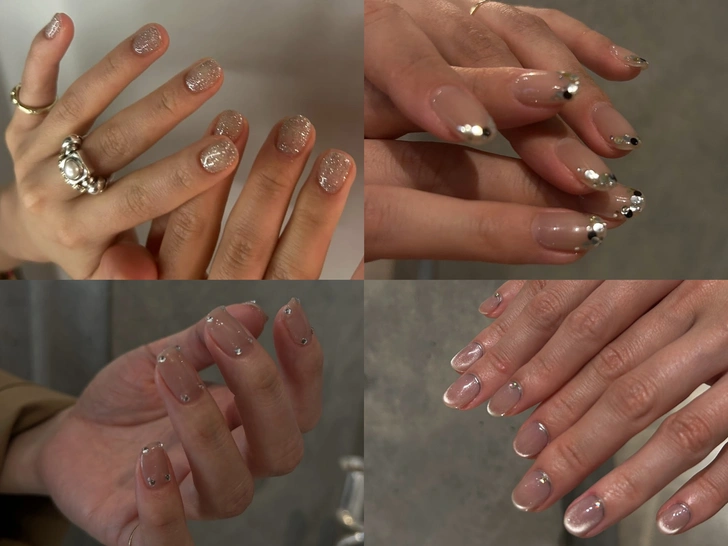 Поверх любимого нюдового оттенка добавляем стразы и круглые пайетки, наносим линии металлической краской или оставляем россыпь из блесток. В общем, делаем все, чтобы наши ногти сверкали ярче любых бриллиантов.