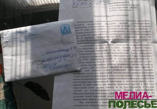 На нашу просьбу сделать пешеходную дорожку с твёрдым покрытием вообще никак не отреагировали. В ответе сказано, что гаражи не зарегистрированы. Но, мало кто из жителей, которые обратились в горисполком, являются владельцами данных гаражей. И если действительно была комиссия, как написано в ответе, то почему члены этой комиссии не пригласили никого из жителей?