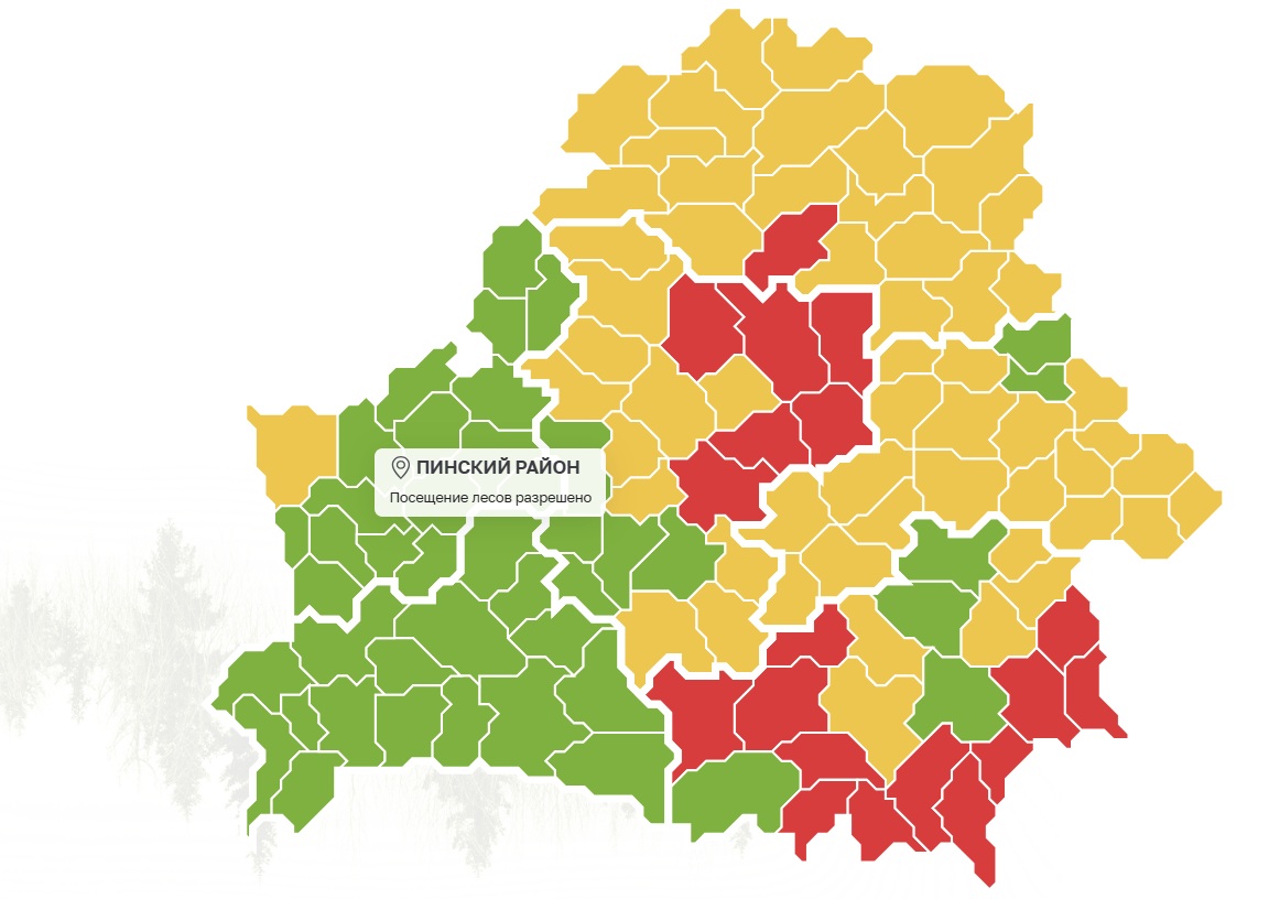 Согласно интерактивной карты Минлесхоза, наибольшее количество районов, отмеченных желтым и красным цветом, в Гомельской и Минской областях.