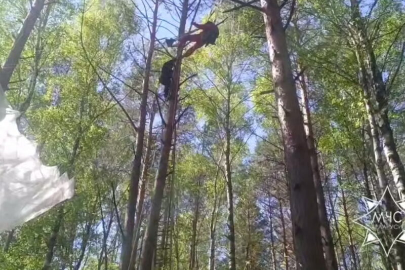 Инцидент произошел сегодня днем, когда члены секции парашютного спорта Брестского аэроклуба совершали плановые прыжки с парашютом из самолета. Одну из парашютисток снесло ветром в сторону леса. Стропы парашюта зацепились за дерево, и девушка повисла на высоте около 12 м.
