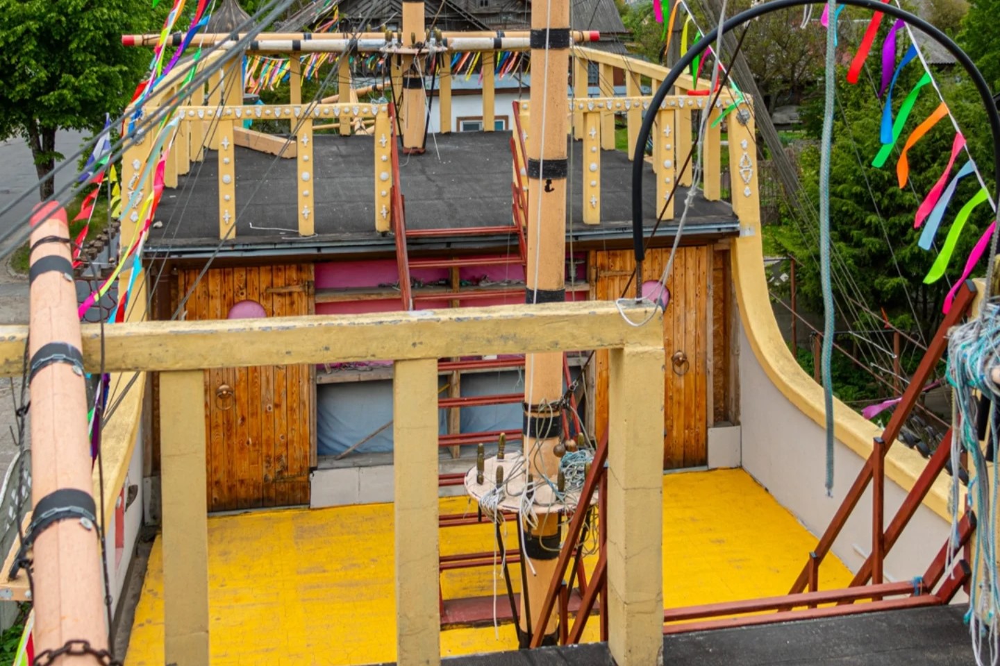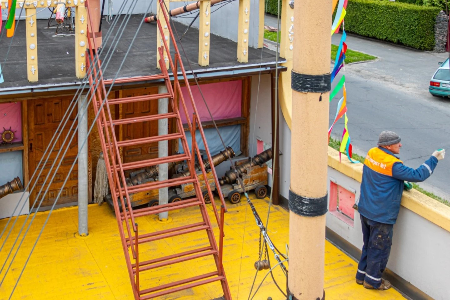 Мечта детства и морская ностальгия воплотились в проекте, которому бы позавидовал любой парк аттракционов. Судно высотой почти 6 метров, длиной около 15 метров и шириной 4,5 метра выглядит как настоящий фрегат: с мачтами, якорями, штурвалом и даже пушками для обороны.