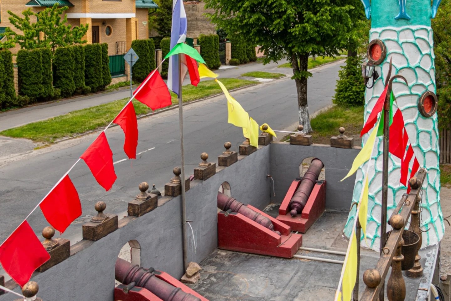 Этот фрегат находится прямо во дворе обычного частного сектора и поражает своей реалистичностью и размахом.
