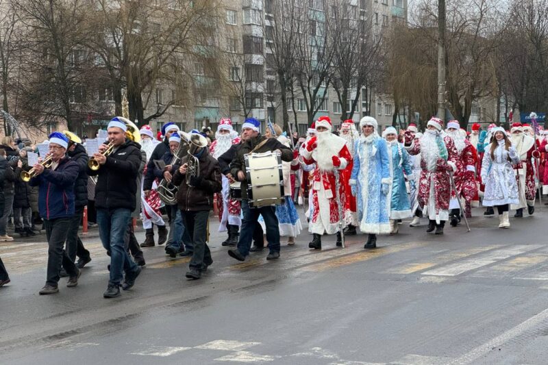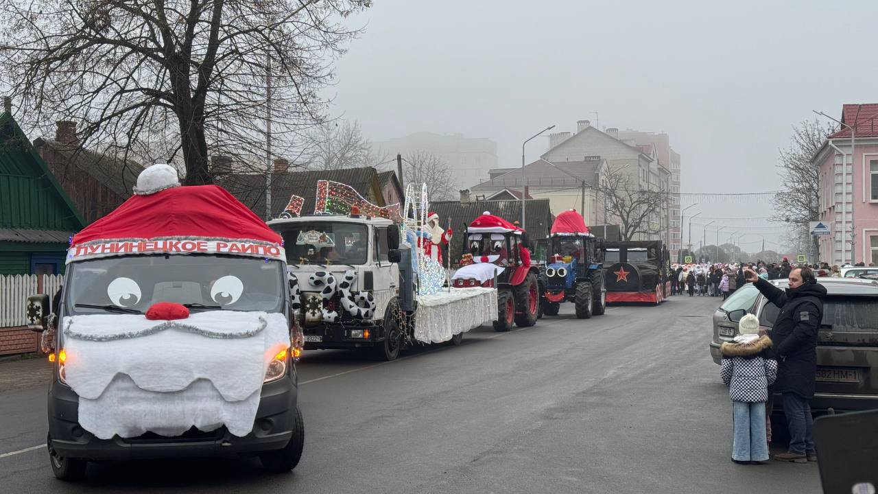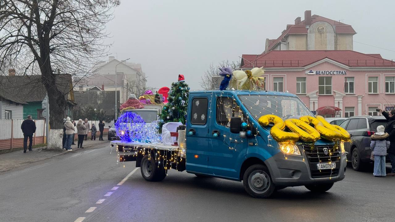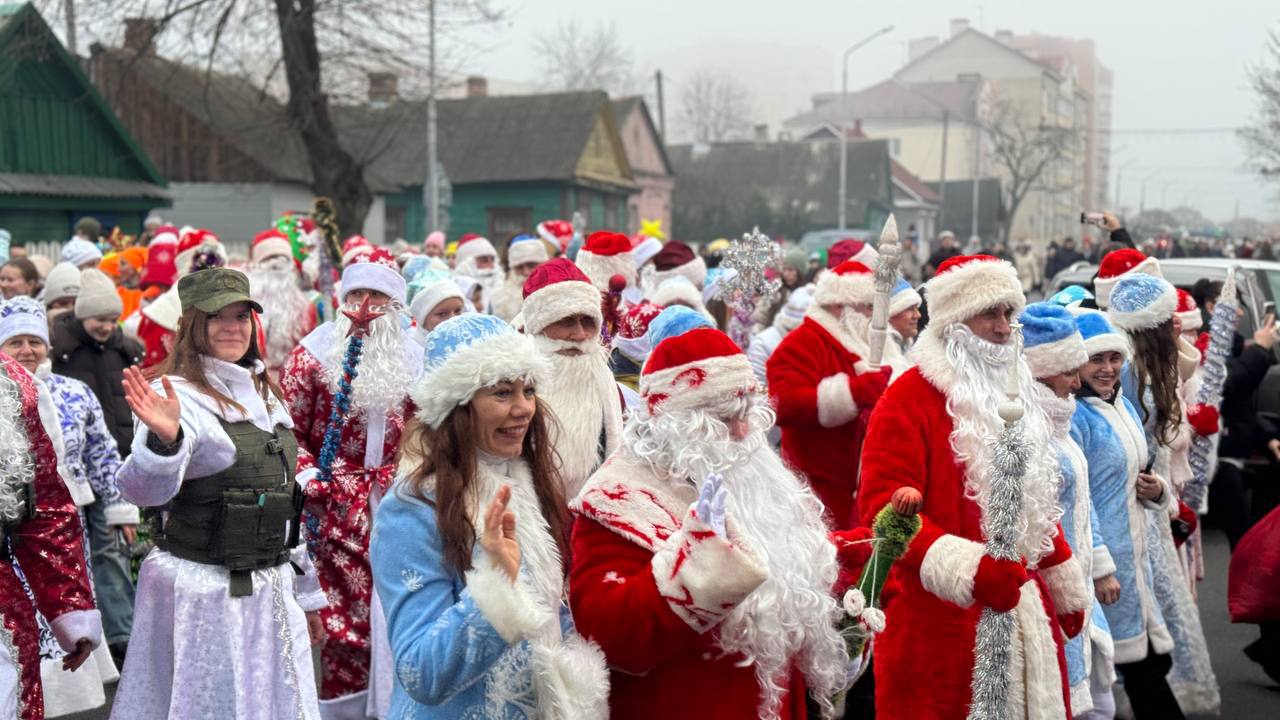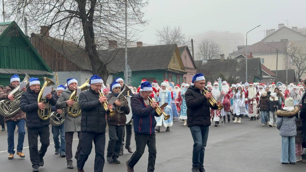 По улице с оркестром прошли новогодние персонажи в Лунинце и зажгли огни на ёлке