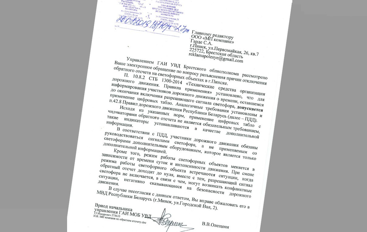 В унитарном предприятии «СМЭП Брестской области», Медиа-Полесью пояснили, что светофорные объекты с обратным отсчётом были демонтированы и отключены в соответствии с выданным техническим заданием ГАИ УВД Брестского облисполкома.