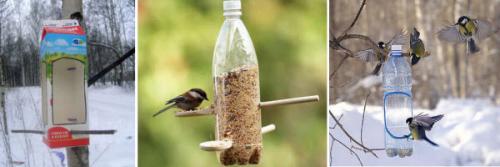 Чаще всего неравнодушные к судьбе птиц в зимой люди мастерят  кормушки из фанеры, дерева или пластика. Достаточно легко и просто сделать кормушки из молочных пакетов и пластиковых бутылок, которые хорошо подойдут  для воробьев и синиц.