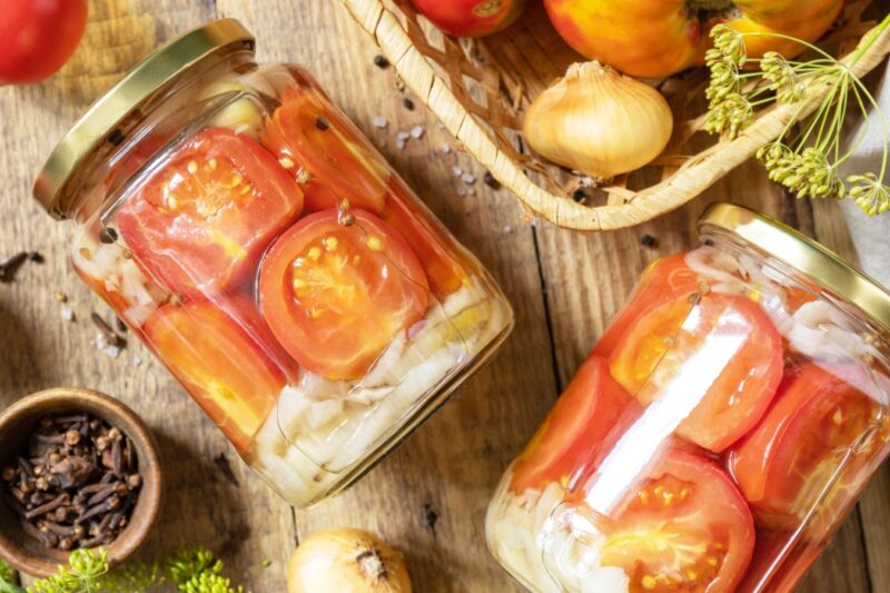 - Выложите лук на дно чистых полулитровых банок. Наполните их помидорами, закиньте перец. Сверху снова уложите лук.