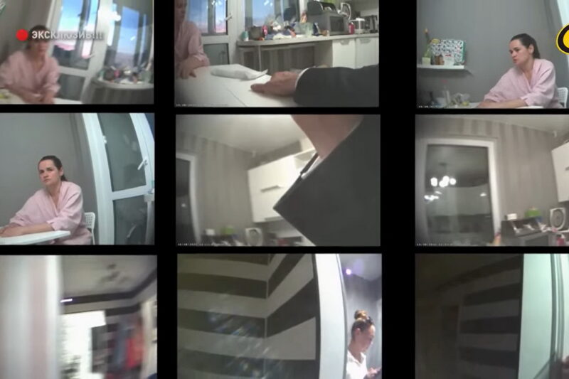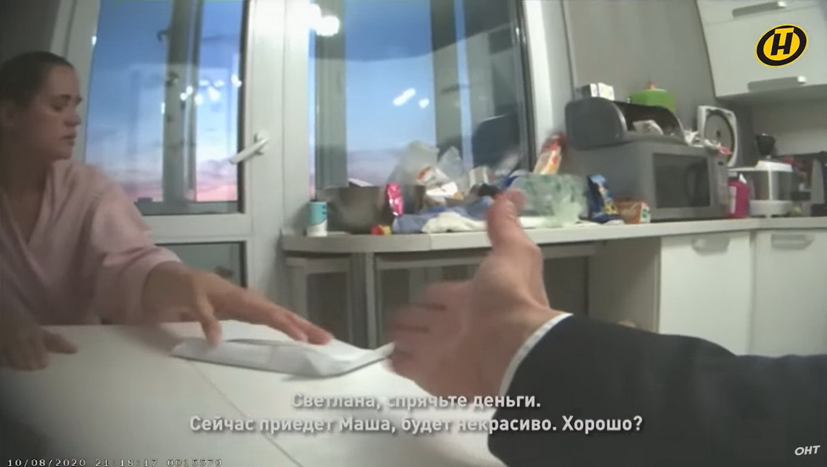 Пропагандисты показали кадры, снятые скрытой камерой, на которых мужской голос, который, как предполагается, принадлежит Павлюченко, произносит «Светлана, вот деньги, которые вы просили» и просит спрятать белый конверт, который лежит на кухонном столе, пока не приехала Мария Мороз.