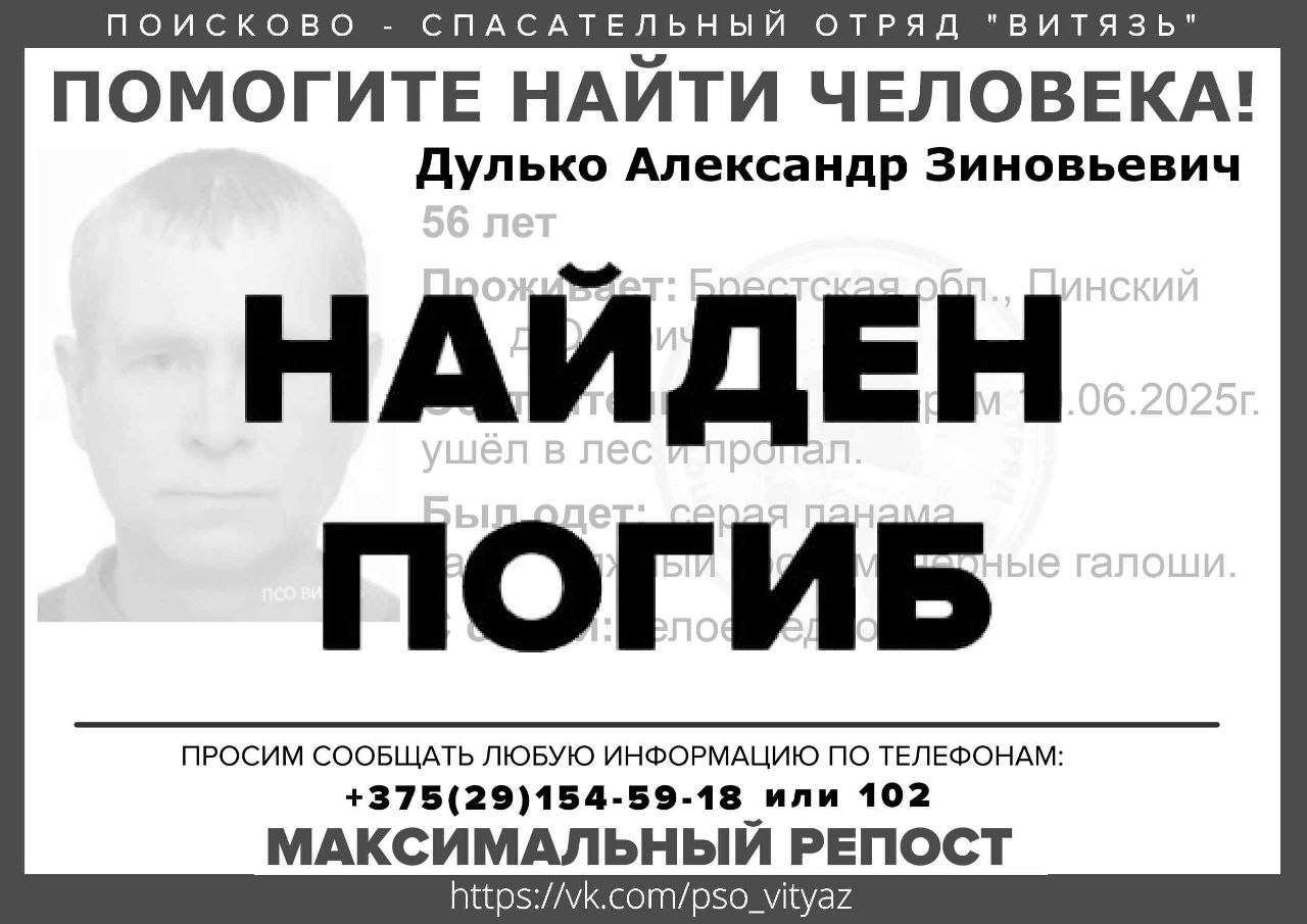 Пять дней не прекращались активные поиски: работники Пинских РОВД, РОСН «Зубр», РОЧС, волонтеры ПСО «Витязь», работники лесхоза , принимали участие в поисках, меняя экипажи.