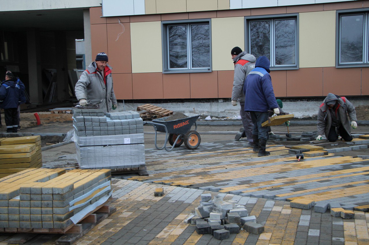 На первом этаже работы выполняет Пинское РСУ, благоустройство территории центральной больницы с укладкой плитки и прокладкой инженерных сетей – УМСР-36 стройтреста № 2. На финишной прямой – обустройство фасада блока А.