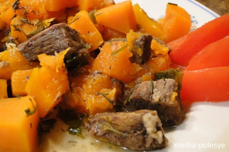 Нарезаем очищенную тыкву кубиками. Также поступаем с перцем и мясом. Включаем разогреваться духовку до 200 градусов.