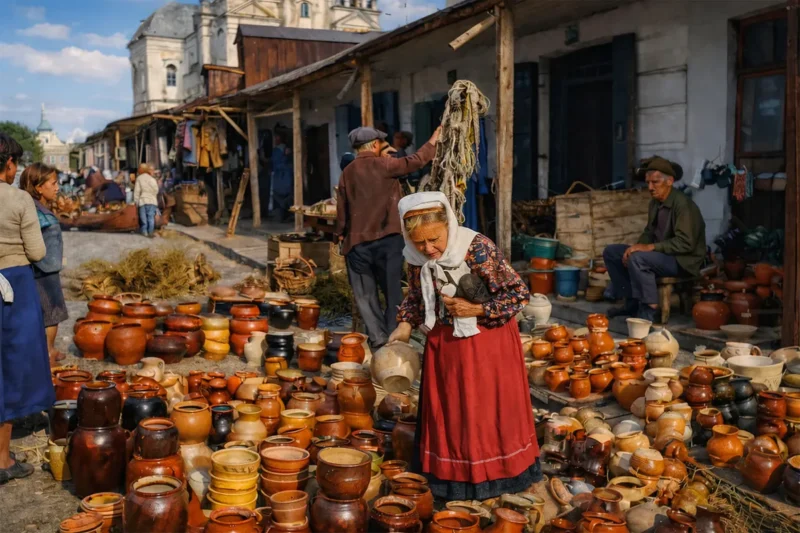 Эта фотография является ценным историческим свидетельством торговой жизни Пинска и развития народных промыслов в регионе в межвоенный период.