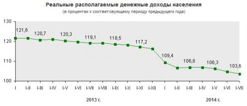 Реальные доходы, то есть доходы за вычетом налогов и сборов, скорректированные на инфляцию, в январе-июле 2014 года по сравнению с аналогичным периодом прошлого года выросли на 3,6%.