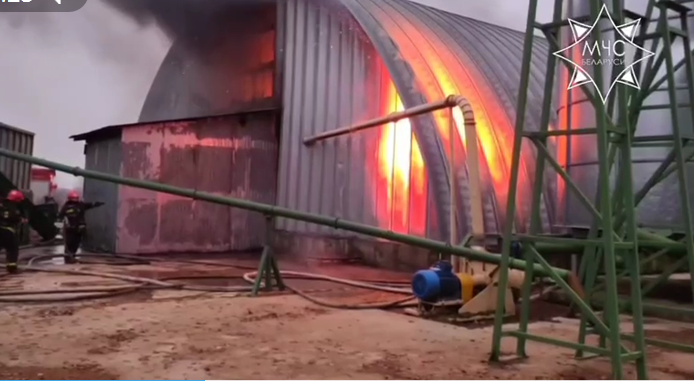 По прибытии к месту вызова подразделений МЧС наблюдалось горение готовой продукции внутри металлического арочного склада, людей внутри не было, сообщает ОУМЧС.