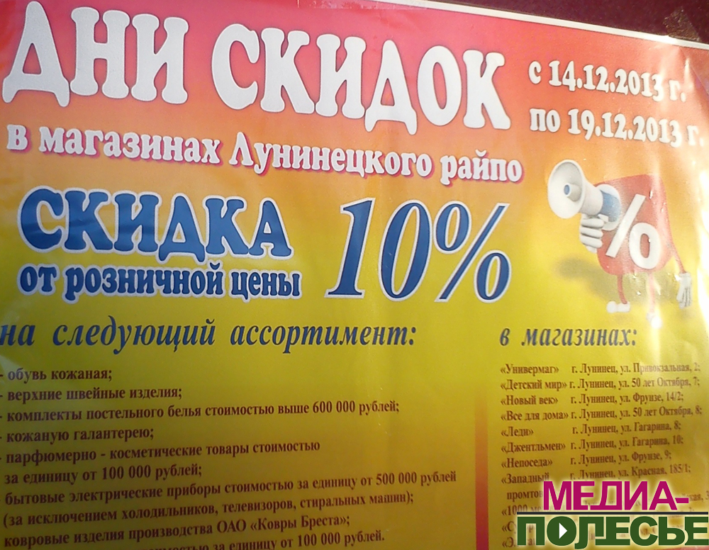 Многие из торговых сетей Лунинетчины в преддверии новогодних праздников предлагают продажу товаров со скидками. Для нашего города, согласитесь, явление не частое. Хотя и весьма приятное.