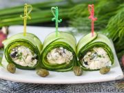 Идея простой и быстрой закуски. Чтобы сделать огуречные ролы, не требуется серьезной подготовки, процесс занимает 15 минут. Использование огуречных слайсов для заворачивания начинки очень упрощает приготовление закуски.