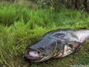 Отец и сын приехали порыбачить на Припять из Гродненской области. Первая поклёвка стало удачной и рыбаки выудили сома рекордных размеров.