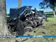 Машина съехала в кювет и врезалась в фонарный столб и дерево.