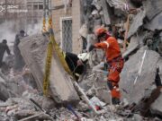 Спасатели продолжали разбирать завалы разрушенной многоэтажки с наступлением темноты.