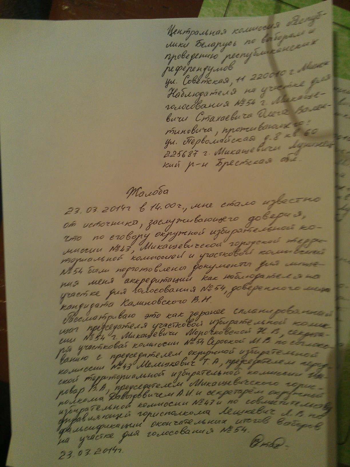 В Микашевичах на участке для голосования №54 в день выборов произошёл беспрецедентный случай: доверенное лицо со стороны независимого кандидата к концу голосования лишили права наблюдать за выборами.