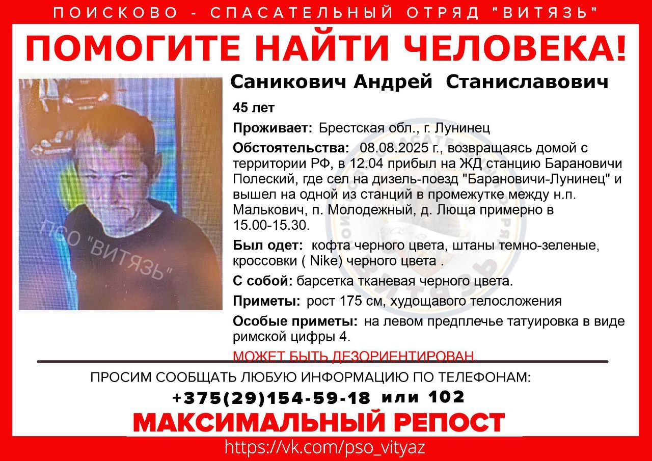 45-летний лунинчанин Сергей Саникович возвращался из заработков в Санкт-Петербурге, сел на дизель-поезд в Барановичах, вышел на одной из станций и пропал.