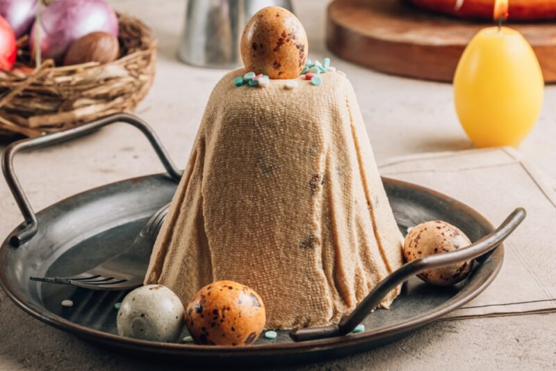 - Аккуратно освободите пасху от формы и марли, перевернув десерт на блюдо.