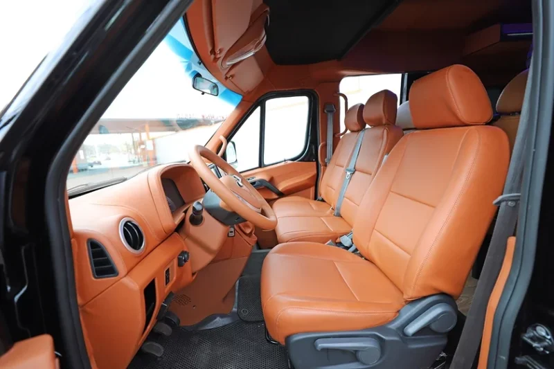 Просторный салон имеет 7 кожаных кресел повышенной комфортности с функцией откидывания назад, телевизор, систему сенсорного управления аудио и видео, откидной столик, полки для размещения личных вещей, USB-разъемы, подстаканники.