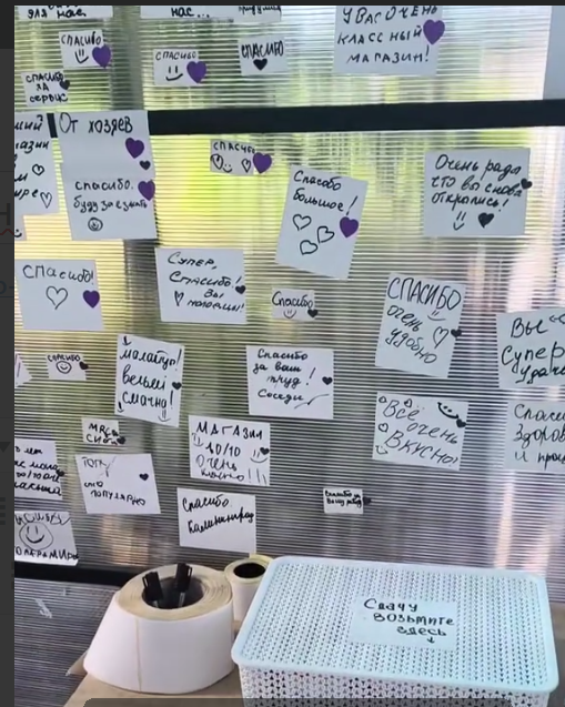 На одной из стен — стикеры с благодарностями владельцам. Покупатели пишут, что всё вкусно, говорят «спасибо» за идею и доверие.
