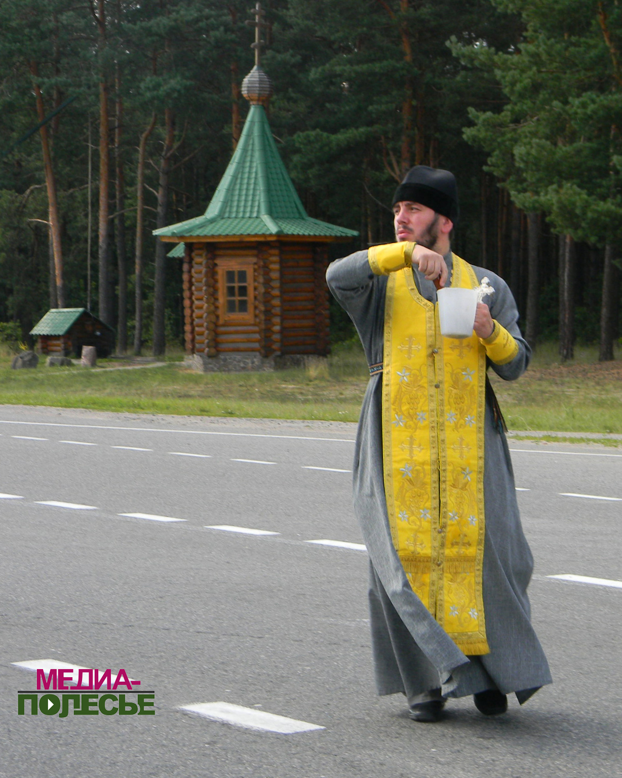 Первым остановочным пунктом на пути священнослужителя и сотрудника ГАИ стал перекрёсток на трассе М-10 «Граница РФ-Гомель-Кобрин» при повороте на деревню Синкевичи, унёсший недавно жизни четверых человек. Отец Сергий прочёл молитву и окропил перекрёсток святой водой.