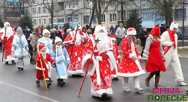 Ровно в 12.55 со всех дворов улицы Первомайской стали выходить Деды Морозы и Снегурочки и строиться в колонну возле общежития, в самом начале улицы. Затем шествие началось.