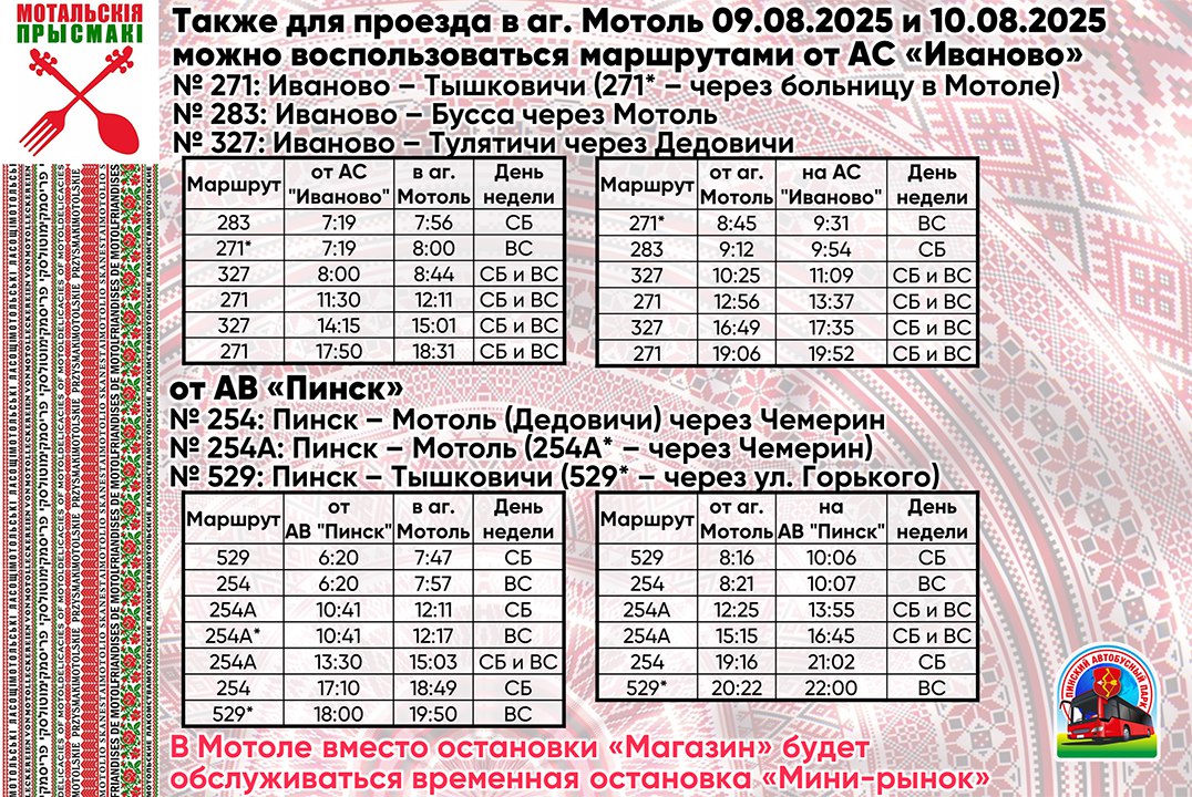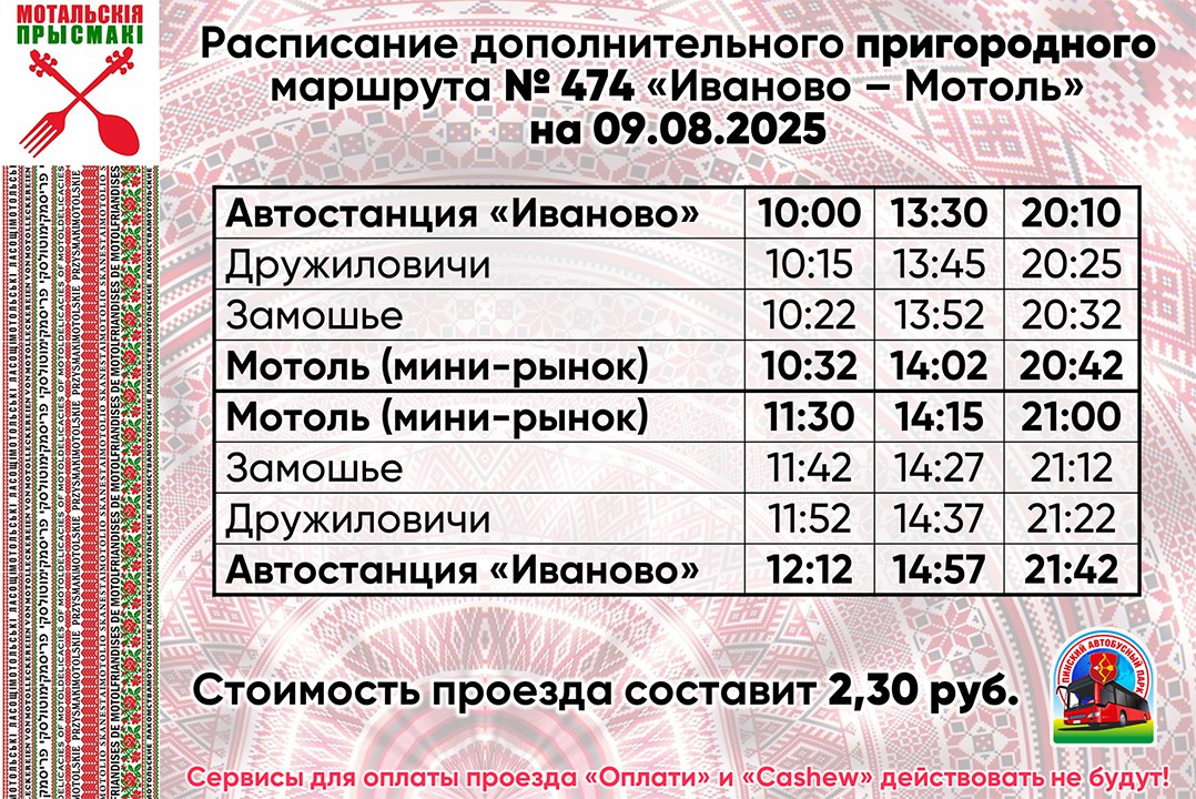 В связи с проведением ХIII международного фестиваля фольклора «Мотальскія прысмакі» 9 и 10 августа организовывается дополнительный пригородный маршрут №474 сообщением Иваново-Мотоль. Отправление рейсов от АС «Иваново» будет производиться в 10:00, 13:30 и 20:10, из аг. Мотоль (район рынка вблизи пересечения улиц Советская и Ленина) – в 11:30, 14:15 и 21:00. Стоимость проезда составит 2,30 рубля.
