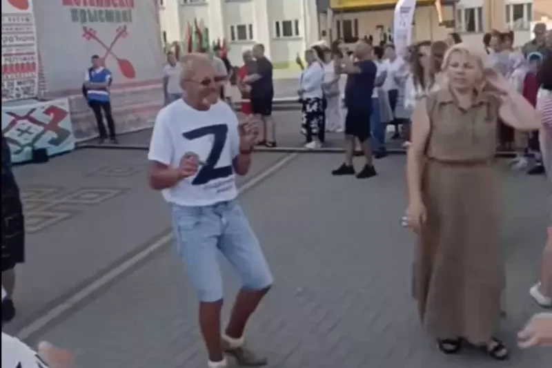 Среди танцоров выделяется мужчина в белой майке с большой черной буквой Z.