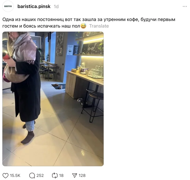 «Одна из наших постоянниц вот так зашла за утренним кофе, будучи первым гостем и боясь испачкать наш пол», — написала кофейня.
