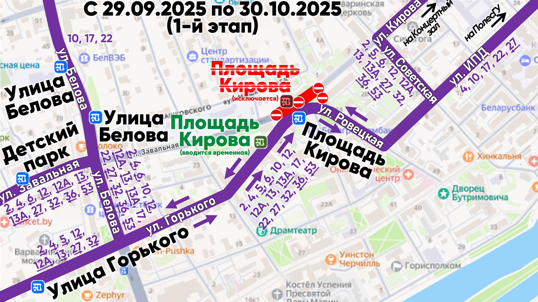 Движение автобусов городских регулярных маршрутов №№ 2, 4, 5, 6, 10, 12, 12А, 13, 13А, 17, 22, 27, 32, 36, 53 и пригородных регулярных маршрутов будет осуществляться по ул. Горького и ул. Ровецкой в обоих направлениях. Остановочный пункт «Площадь Кирова» в направлении ул. Белова временно переносится на ул. Горького.