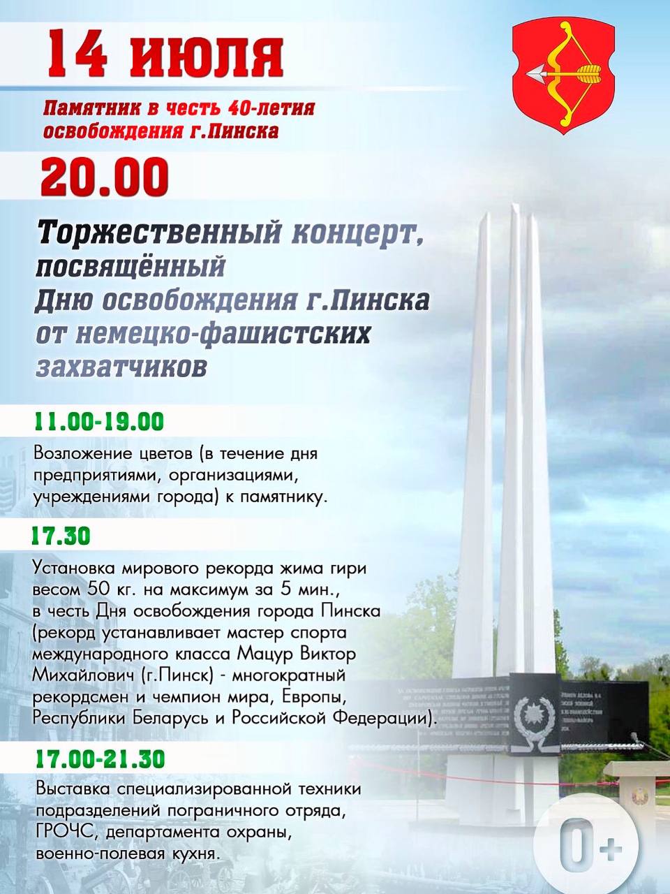 Кроме традиционных митинга и концерта, в 17.30 состоится, как говорится в программе, установка мирового рекорда жима гири весом 50 кг на максимум за 5 минут в честь Дня освобождения горда Пинска (рекорд устанавливает мастер спорта международного класса Виктор Мацук (г.Пинск) — многократный рекордсмен и чемпион мира, Европы, Республики Беларусь и Российской Федерации.