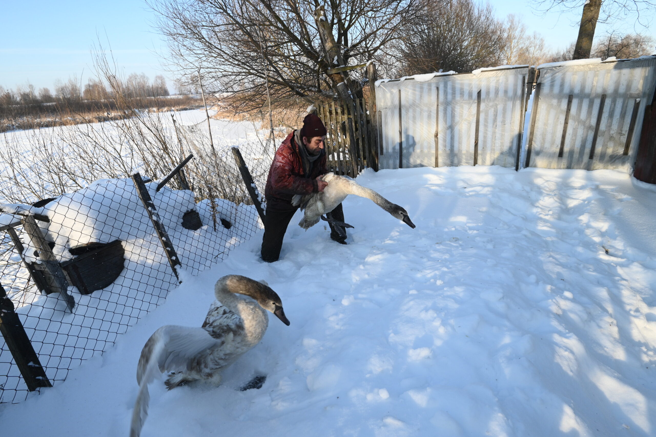 Ещё в декабре они плавали в реке, где им хватало корма. А после старицу сковало льдом, птицы вплотную подобрались к подворью Белоусов, перехватывали корм у домашней птицы. Семья посчитала, что существование лебедей стало небезопасным — к ним начали подбираться лисы, и забрала птиц на подворье. Хозяин сам передвигается с палочкой, но пропасть красавцам не позволил.